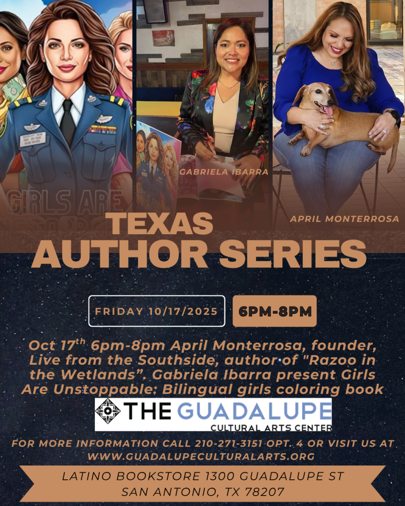 TEXAS AUTHOR SERIES FALL EVENTS Join us every month in the fall for free Texas Author Readings, held on October 17, November 7 & December 19 at 6 pm at the Guadalupe Latino Bookstore