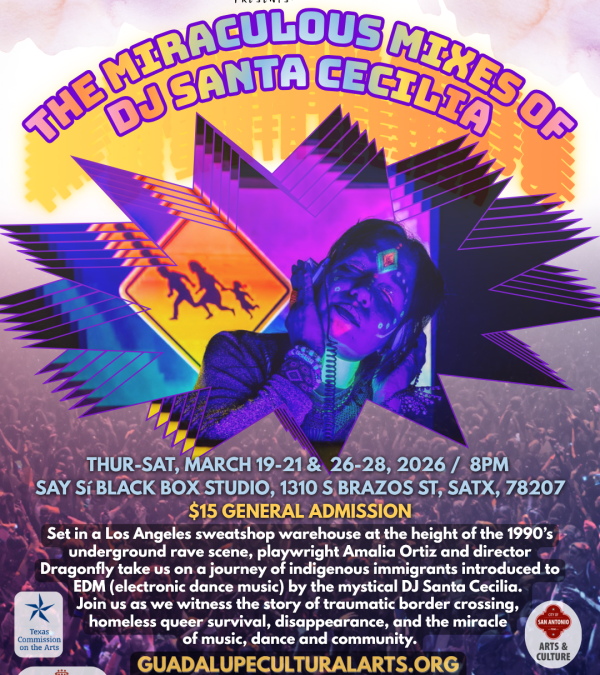 SAN ANTONIO — The Guadalupe Cultural Arts Center Theater Arts program proudly announces the premiere of The Miraculous Mixes of DJ Santa Cecilia, an electrifying new theatrical work written by Amalia Ortiz and directed by Robin LaVerne “Dragonfly” Wilson. Performances will run March 19–21 and March 26–28 at 8 PM at SAY Sí’s Black Box Studiolocated at 1310 S. Brazos St., San Antonio, TX 78207 (one block south of the Guadalupe Theater). Tickets are $15 general admission and available at www.guadalupeculturalarts.org.