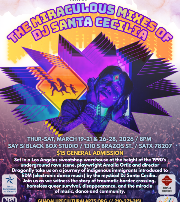SAN ANTONIO — The Guadalupe Cultural Arts Center Theater Arts program proudly announces the premiere of The Miraculous Mixes of DJ Santa Cecilia, an electrifying new theatrical work written by Amalia Ortiz and directed by Robin LaVerne “Dragonfly” Wilson. Performances will run March 19–21 and March 26–28 at 8 PM at SAY Sí’s Black Box Studio, located at 1310 S. Brazos St., San Antonio, TX 78207 (one block south of the Guadalupe Theater). Tickets are $15 general admission and available at www.guadalupeculturalarts.org.